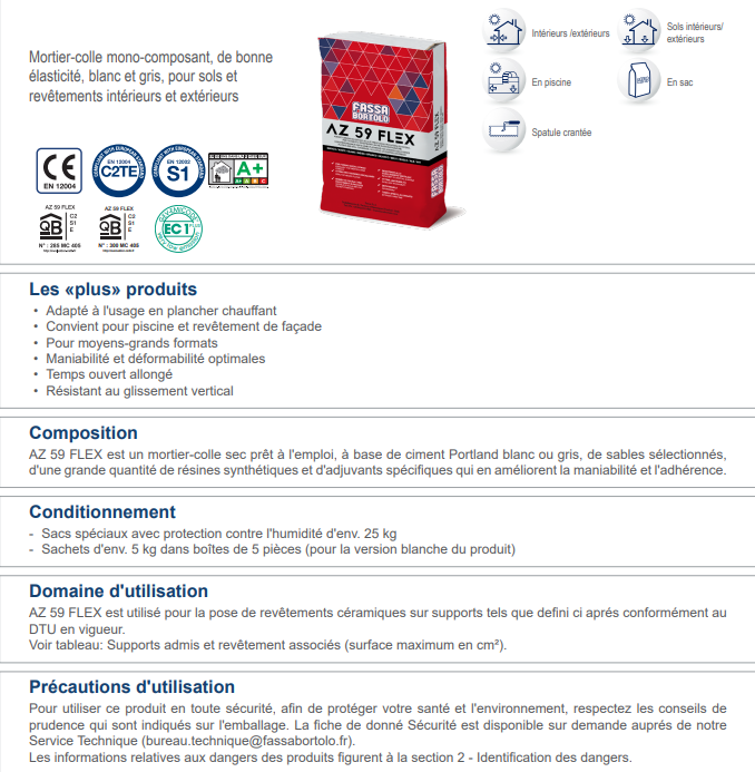 Domaine d’utilisation : AZ 59 FLEX est utilisé pour la pose de revêtements céramiques sur supports tels que defini ci aprés conformément au DTU en vigueur.